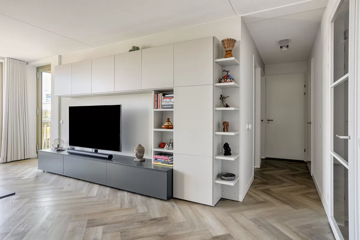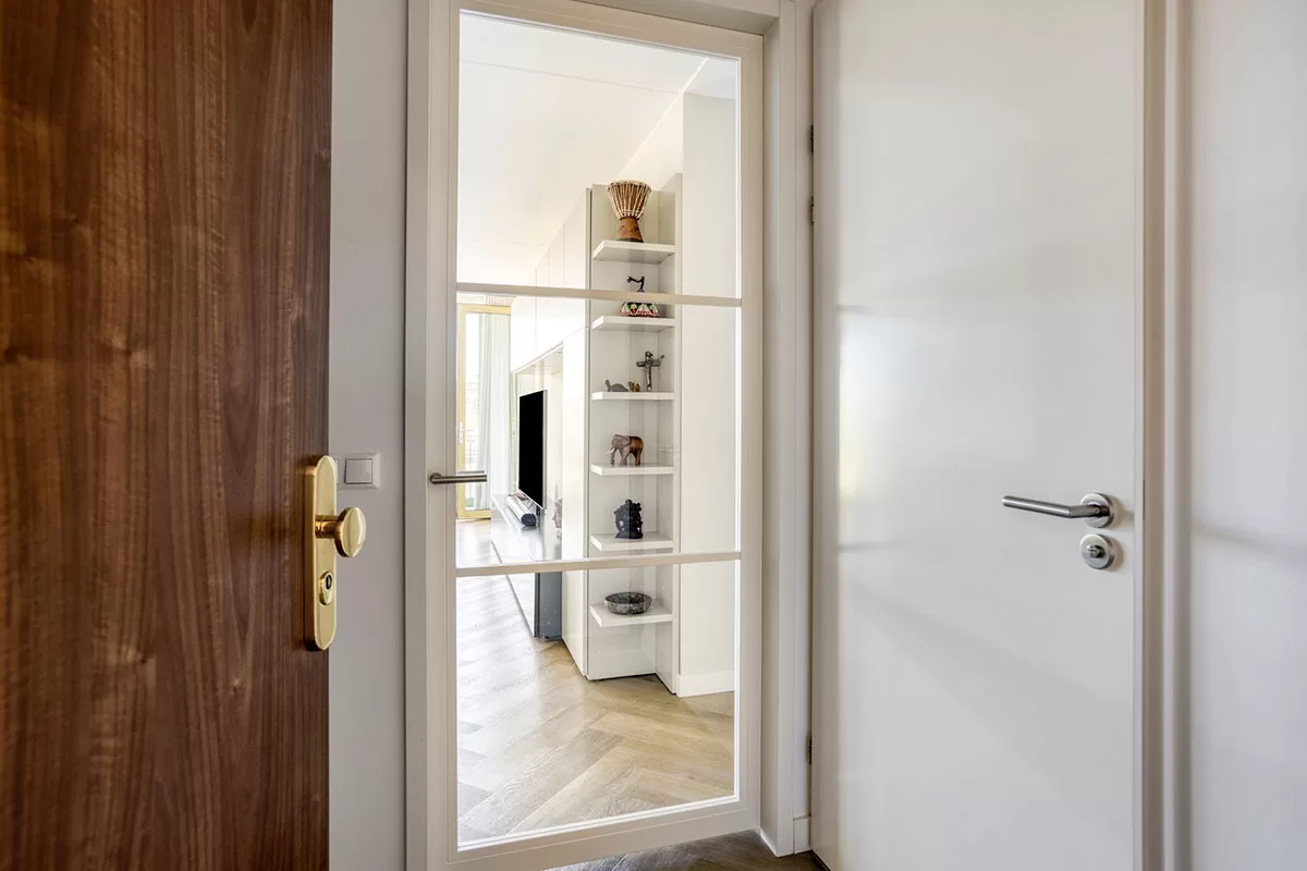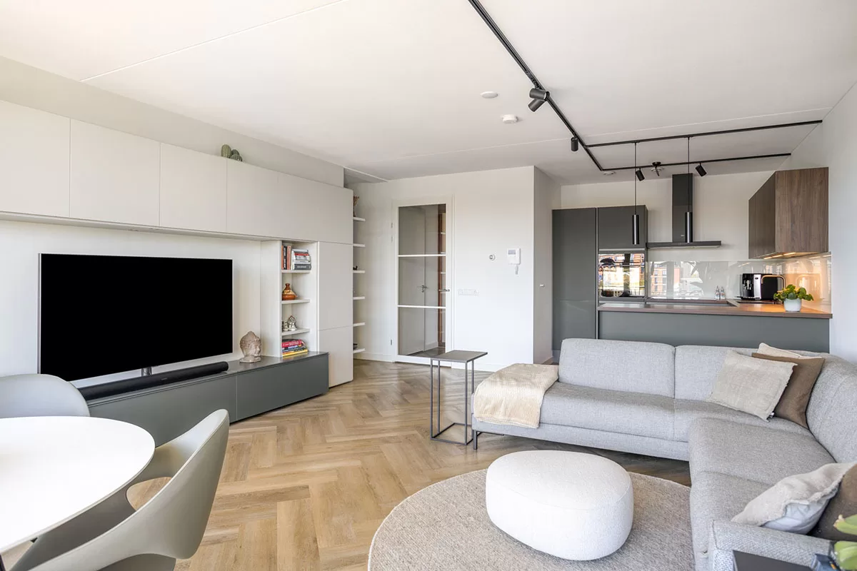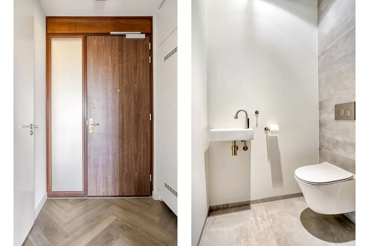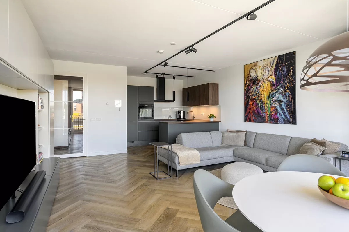 Via de brede en verzorgde gang bereikt u de voordeur van het appartement. Bij binnenkomst valt direct de hoogwaardige afwerking op, waaronder de stijlvolle visgraadvloer met comfortabele vloerverwarming die door het gehele appartement is doorgelegd.