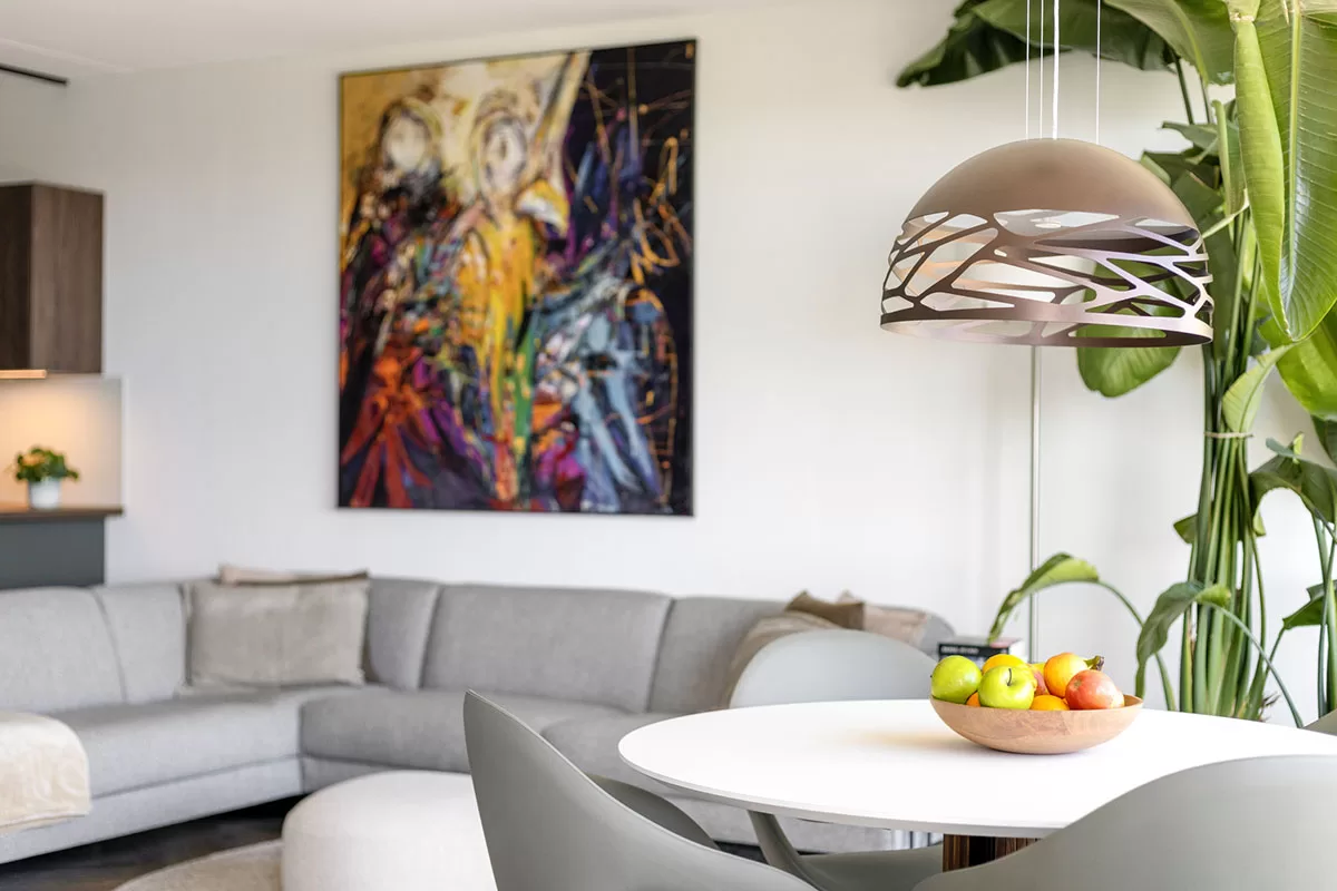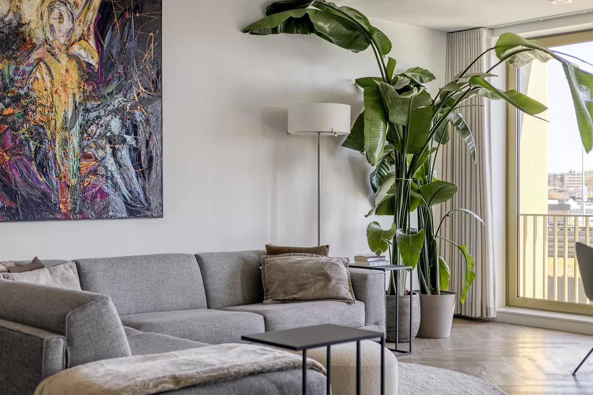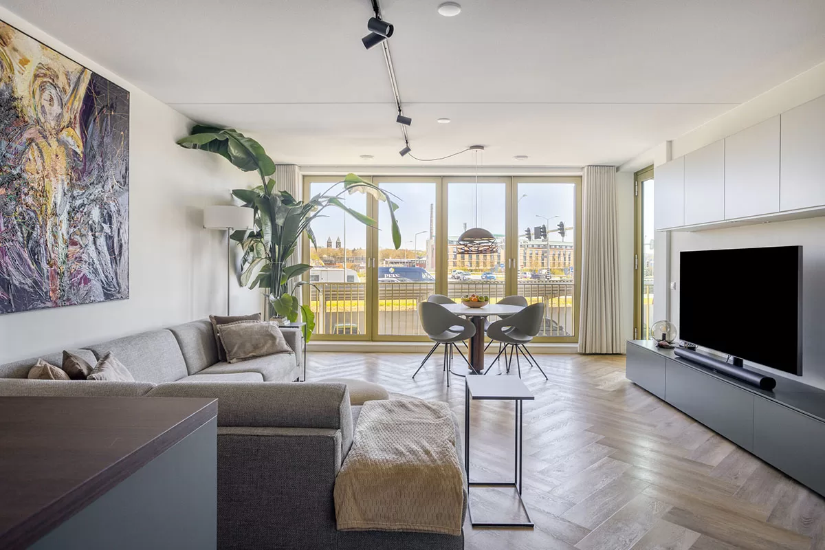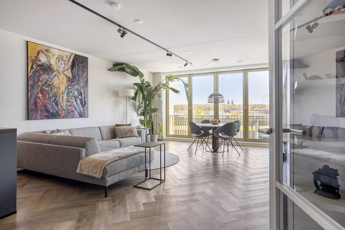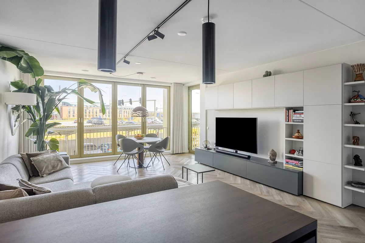 Via de brede en verzorgde gang bereikt u de voordeur van het appartement. Bij binnenkomst valt direct de hoogwaardige afwerking op, waaronder de stijlvolle visgraadvloer met comfortabele vloerverwarming die door het gehele appartement is doorgelegd.