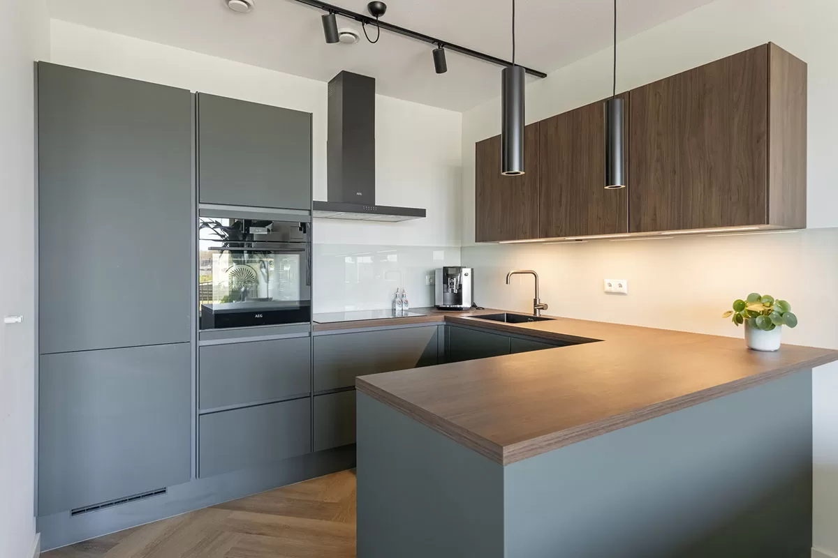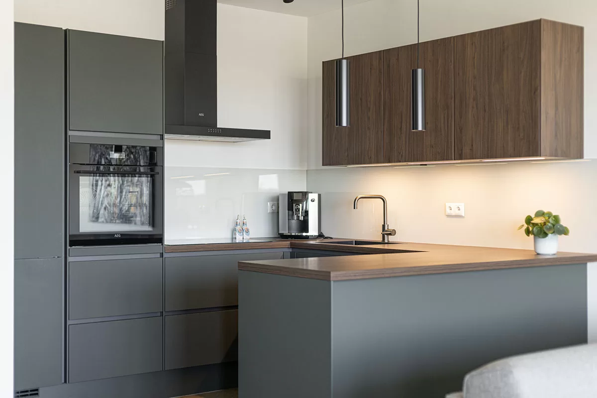 De open keuken is uitgevoerd in een elegante kleur en voorzien van een luxe werkblad en diverse inbouwapparatuur, waaronder een inductiekookplaat met afzuiging, vaatwasser, koelkast + diepvries en oven met stoomfunctie. Een perfecte combinatie van design en functionaliteit.