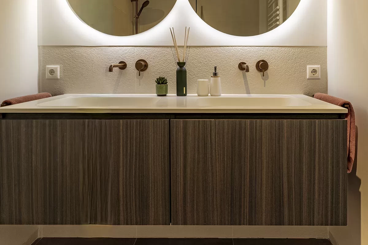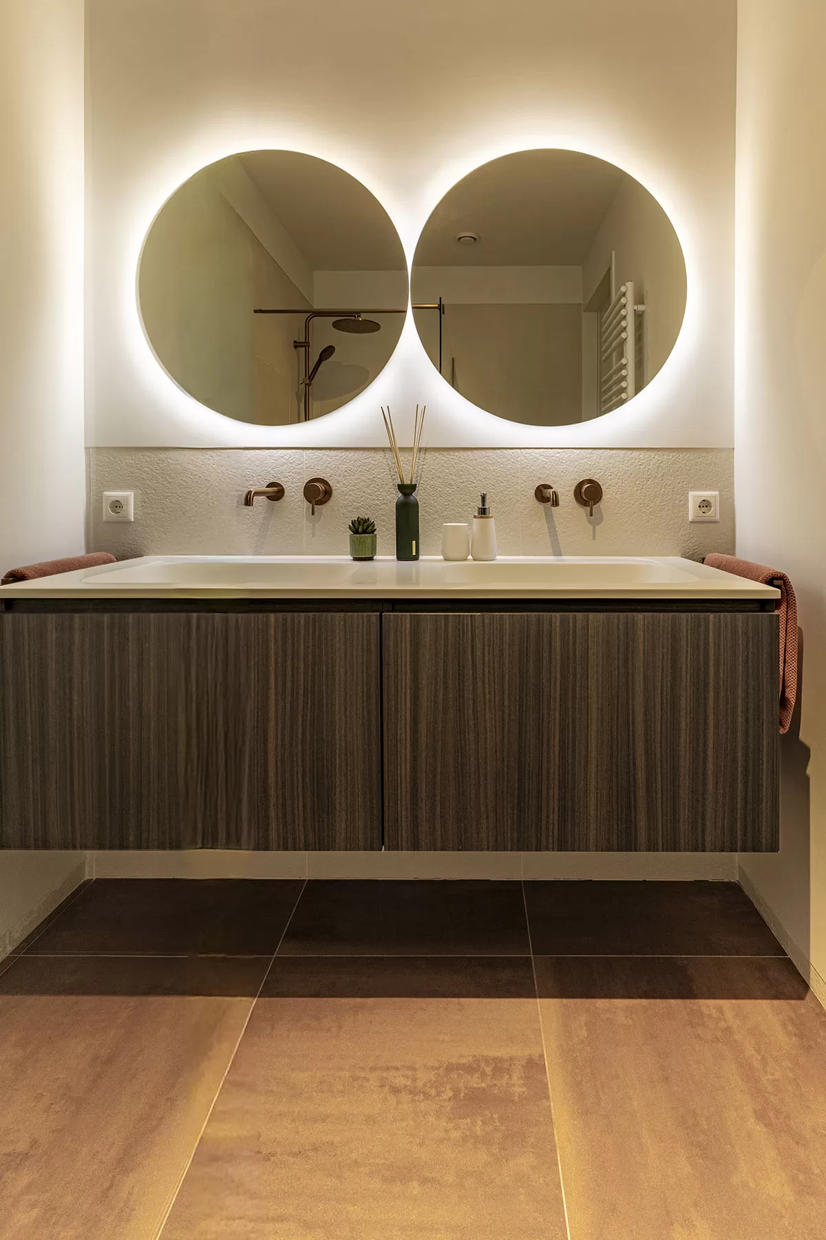 De luxe badkamer is modern en strak afgewerkt, met een inloopdouche, een dubbel wastafelmeubel en 2 grote verwarmde spiegels met verlichting. Ook hier ervaart u het hoge afwerkingsniveau dat in het gehele appartement is doorgevoerd. Deze prachtige badkamer is ook voorzien van een elektrische design radiator.